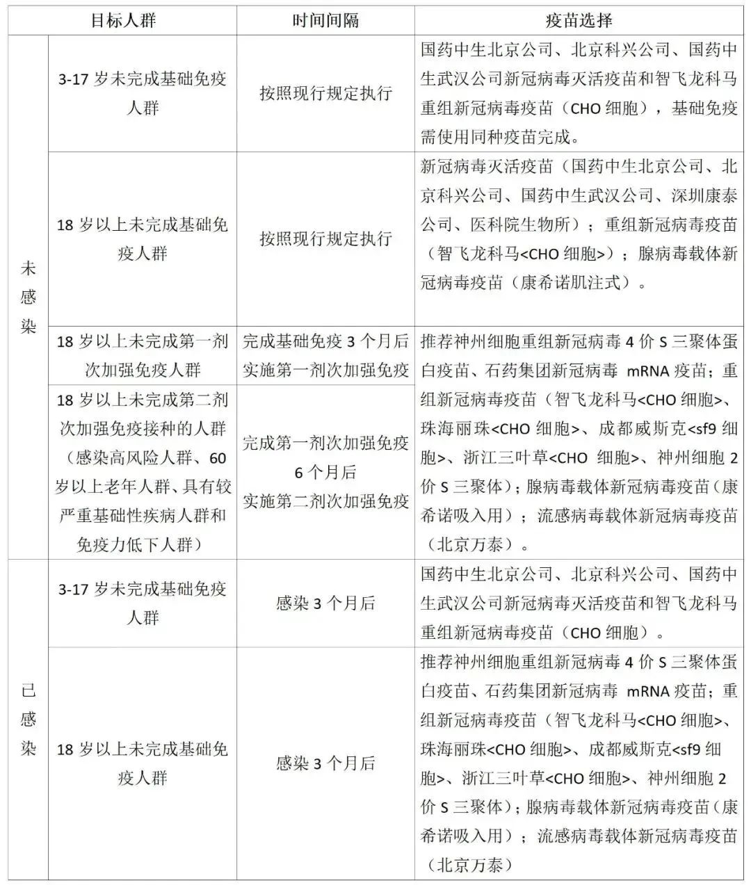 日前,浙江省出臺《浙江省應對近期新冠病毒感染疫情疫苗接種工作方案》,對接種目標人群、時間間隔、疫苗選擇等都有了明確規定。 目標人群 現階段新冠病毒疫苗接種重點是針對不同目標人群補齊免疫水平差距,進一步降低重癥和死亡風險。目標人群如下: (一)未感染且未完成既定免疫程序的人群。包括3—17歲未感染且尚未完成基礎免疫的人群,18歲以上未感染且尚未完成基礎免疫的人群,18歲以上未感染且未完成第一劑次加強免疫的人群,18歲以上未感染且尚未完成第二劑次加強免疫的人群(感染高風險人群、60歲以上老年人群、具有較嚴重基礎性疾病人群和免疫力低下人群)。 (二)已感染且未完成基礎免疫的人群。包括已感染且未完成基礎免疫的3—17歲人群和已感染且未完成基礎免疫的18歲以上人群。