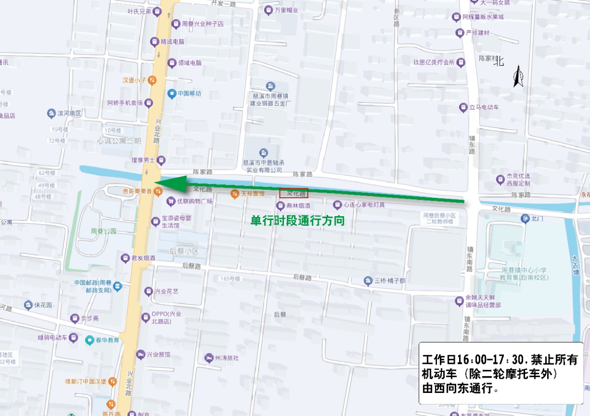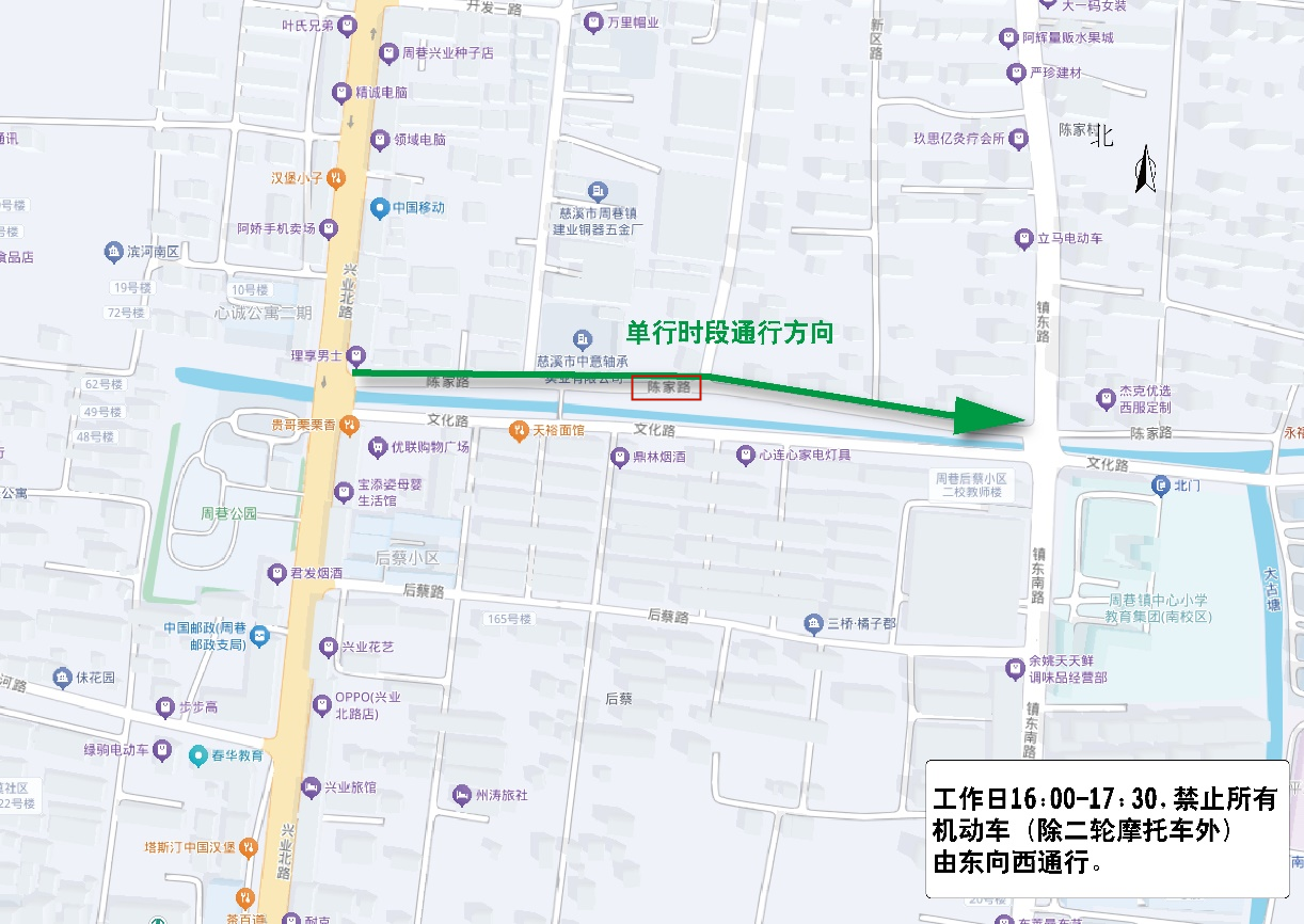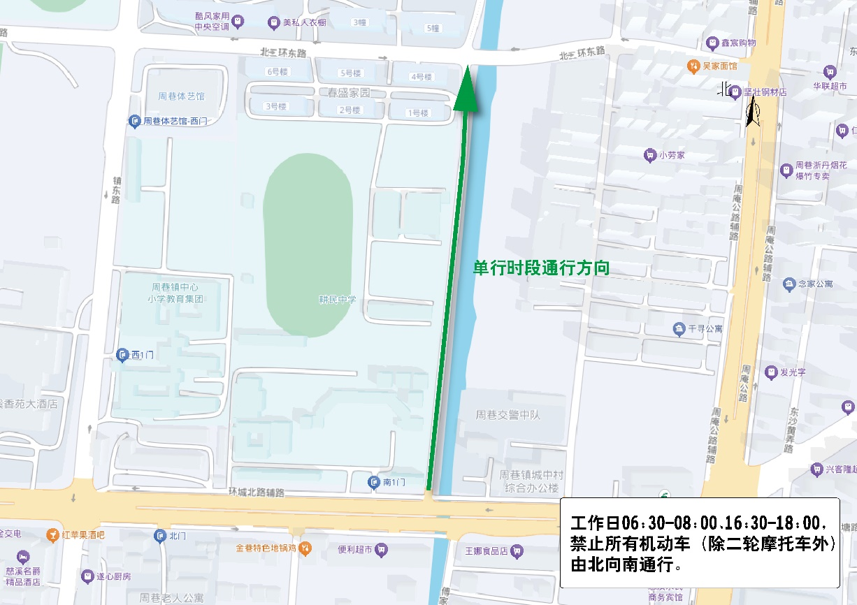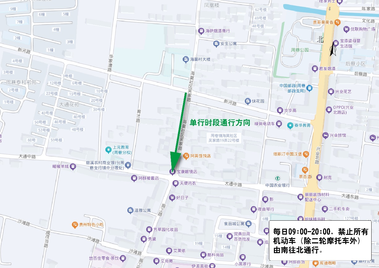 工作日06:30-08:00、16:30-18:00,禁止所有機動車(除二輪摩托車外)由北向南通行。