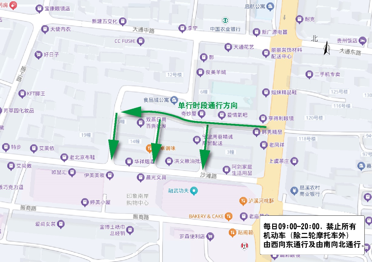 每日09:00-20:00,禁止所有機動車(除二輪摩托車外)由南往北通行。