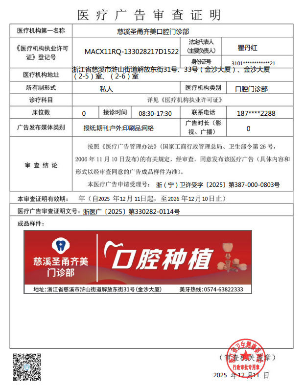 慈溪圣甬齊美口腔門診部于2025年12月11日向我局提出醫療廣告審查申請。按照《醫療廣告管理辦法》等有關規定,經審查,同意發布該醫療廣告(具體內容和形式已經審查同意的廣告成品樣件為準)。