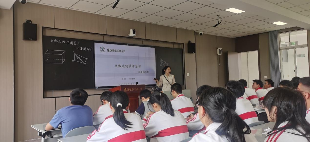 慈溪實(shí)驗(yàn)高級(jí)中學(xué)孫丹青老師以《立體幾何學(xué)考復(fù)習(xí)——以鱉臑為例》為授課內(nèi)容展開(kāi)教學(xué)。課程從我國(guó)古代數(shù)學(xué)專著《九章算術(shù)》切入,結(jié)合教材中相關(guān)例題和課后習(xí)題,引出鱉臑這一經(jīng)典幾何模型。之后,孫丹青老師借助GeoGebra軟件讓學(xué)生直觀感受鱉臑?zāi)P偷男纬蛇^(guò)程及其幾何特征,引導(dǎo)學(xué)生應(yīng)用鱉臑?zāi)P偷膸缀翁卣鹘鉀Q了一道高考題和一道學(xué)考題,并在此基礎(chǔ)上,追加問(wèn)題,從鱉臑?zāi)P拖嚓P(guān)的角度問(wèn)題轉(zhuǎn)到面積問(wèn)題,題型豐富。整個(gè)課堂以一題多解拓寬學(xué)生思維,以高考評(píng)分標(biāo)準(zhǔn)強(qiáng)調(diào)答題規(guī)范性,有效激發(fā)了學(xué)生的探究熱情,課堂氛圍活躍有序。
