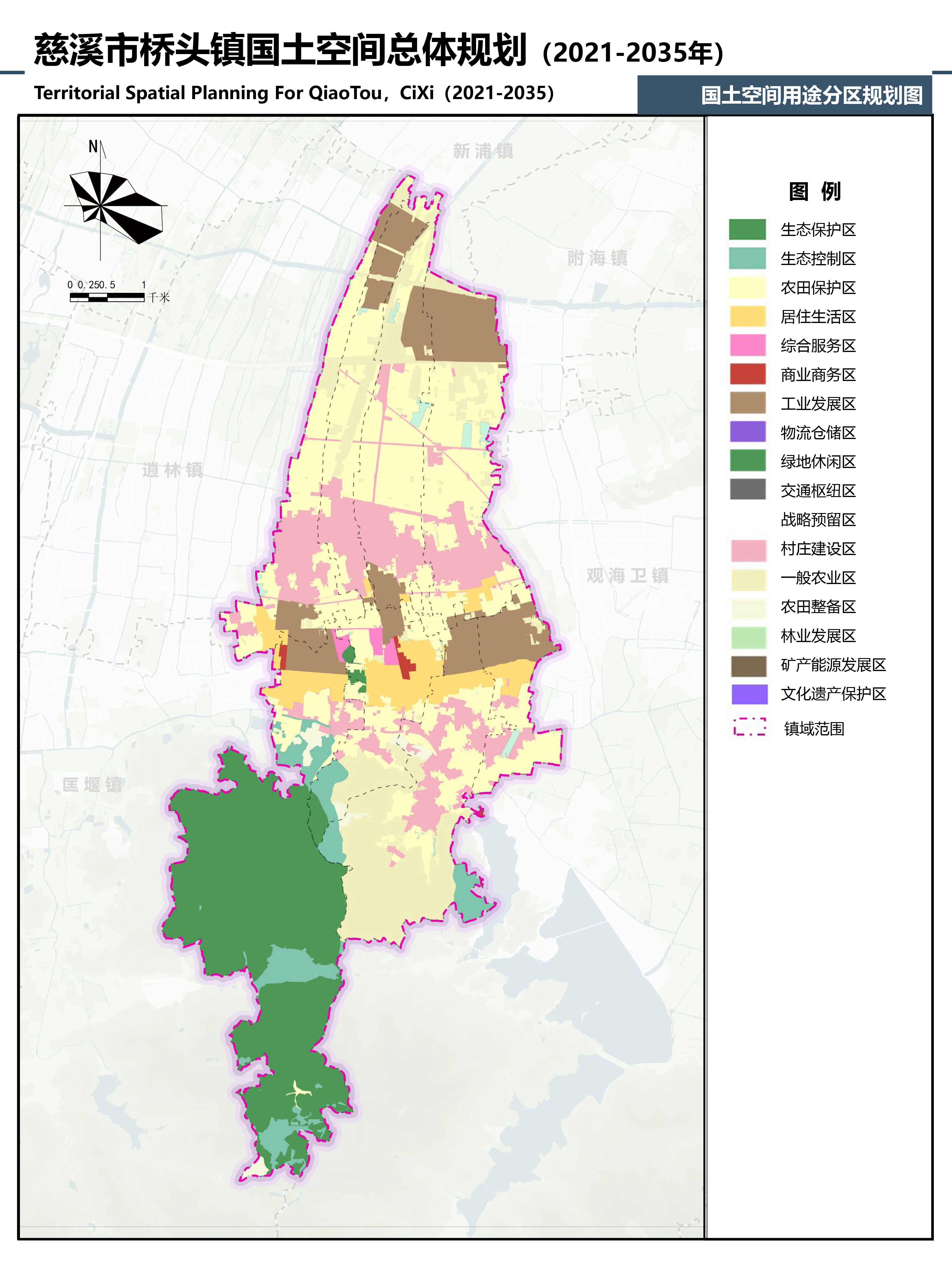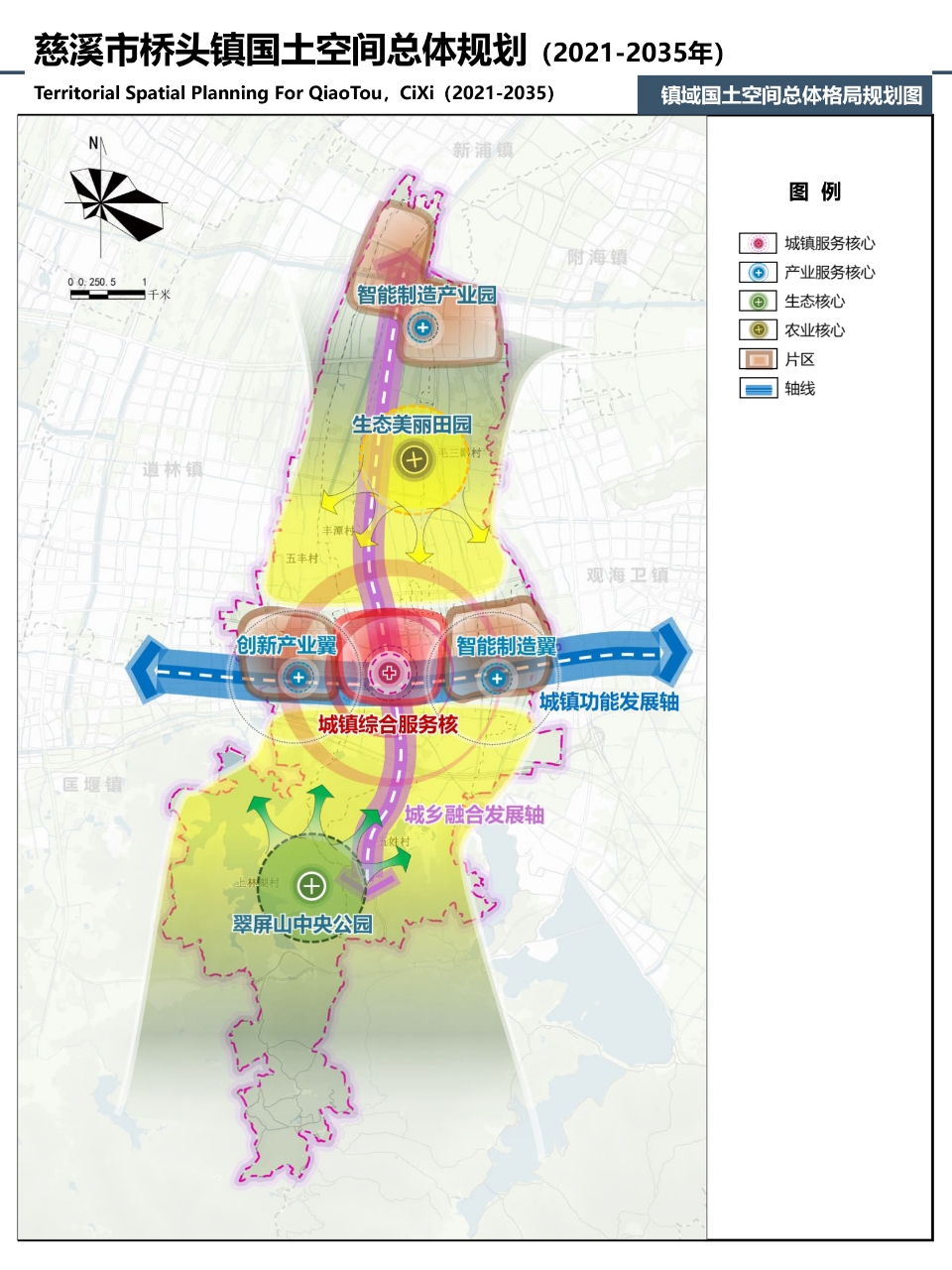 接軌寧波“一體兩翼多組團(tuán)、三江三灣大花園”的總體格局,銜接慈溪“一心雙核四片區(qū)、一園一網(wǎng)山海屏”的總體空間格局,構(gòu)建橋頭鎮(zhèn)“一核雙翼、兩軸三園”的國(guó)土空間開(kāi)發(fā)保護(hù)總體格局。