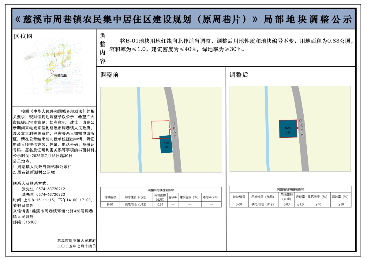 為保障市政基礎設施建設,按照《中華人民共和國城鄉規劃法》的相關要求,現對《慈溪市周巷鎮農民集中居住區建設規劃(原周巷片)》局部地塊調整方案予以公示,希望廣大市民提出寶貴意見。
