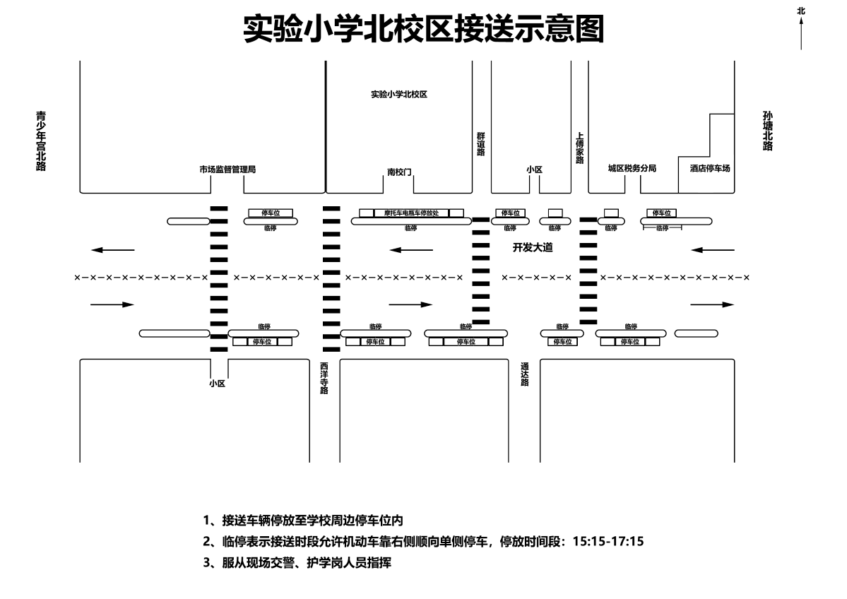 二、優化交通組織方案。為規范校園周邊交通秩序,現結合上下學時段特點(周一至周五7:30-7:45、16:00-17:10),分交通方式優化接送流線。機動車接送實行“即停即走”原則:送學時段車輛即停即離,減少滯留;放學時段建議家長提前或延后一段時間,將車輛停放至開發大道指定泊位,錯峰接送。非機動車接送需在固定區域停放:送學時即停即走,學生步行入校;放學時段非機動車輛統一停放于校南側指定區域,避免占用機動車道。步行學生通過南門專用通道進出,實現人車流線分離,確保通行安全。開發大道路段交通組織方案如下圖所示: