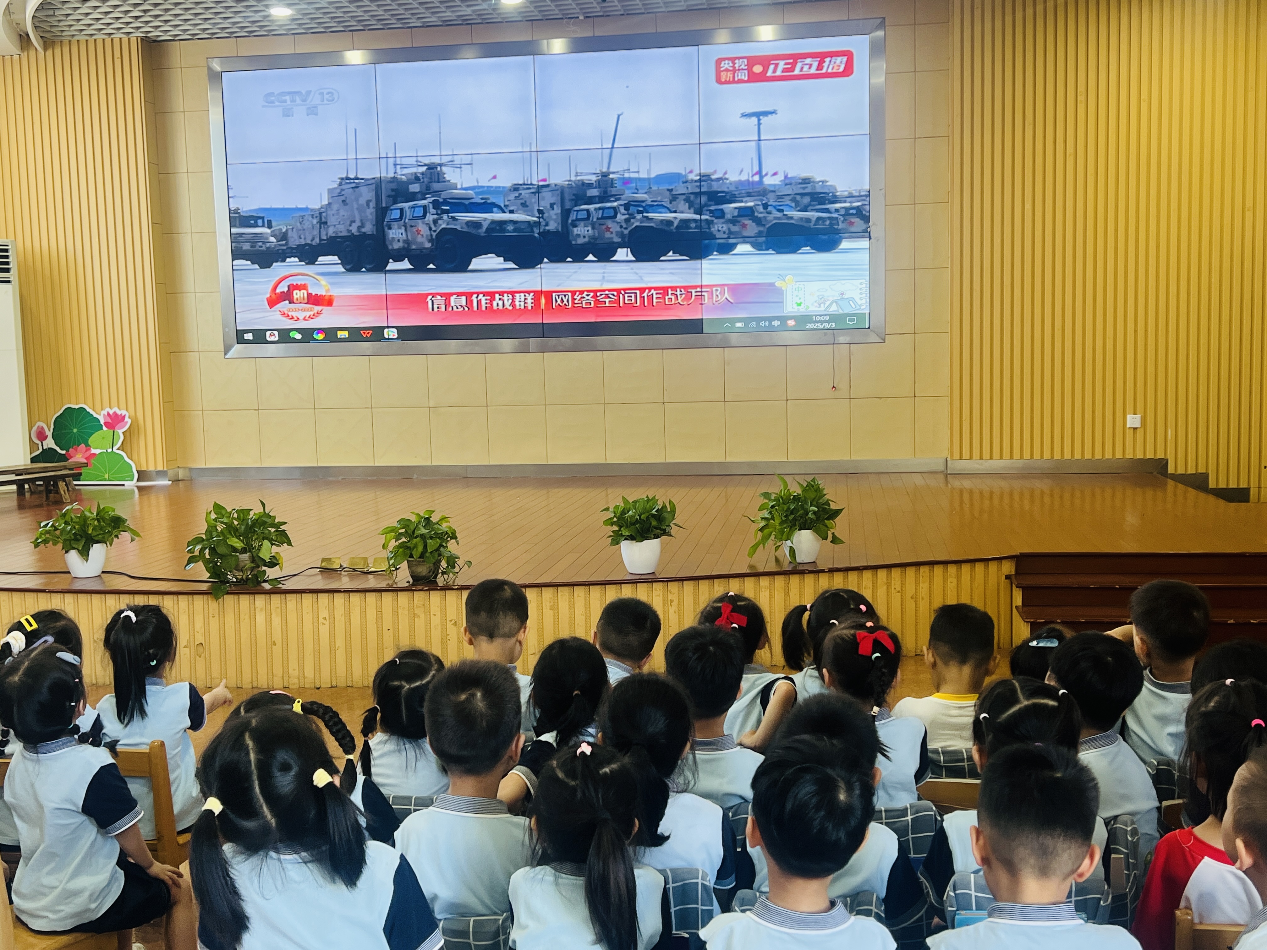 活動當天,托小班的老師們借助生動的紅色故事和形象的繪本,向孩子們講述閱兵儀式的意義,用簡單易懂的語言介紹解放軍叔叔的勇敢與擔當,在孩子們幼小的心靈中播下愛國的種子。中大班的孩子們則集中在多功能廳,全神貫注地觀看閱兵直播。當直播畫面中鮮艷的五星紅旗冉冉升起,孩子們立刻挺直小身板,大聲唱響國歌,稚嫩的歌聲在多功能廳里回蕩。