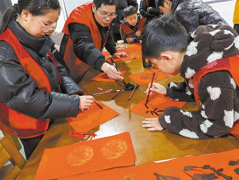 2月10日上午,在長(zhǎng)河鎮(zhèn)寧豐村老年活動(dòng)中心,曙光社會(huì)工作服務(wù)中心的志愿者章海軍帶領(lǐng)小小志愿者們一同開(kāi)展書(shū)法活動(dòng)。作為書(shū)法愛(ài)好者,章海軍耐心指導(dǎo)孩子們執(zhí)筆、運(yùn)筆,大家共同書(shū)寫(xiě)“福”字和春聯(lián)。一行行墨香流淌的祝福,為寧豐村的老人們送去了溫暖而真摯的新春?jiǎn)柡颉?/p>
