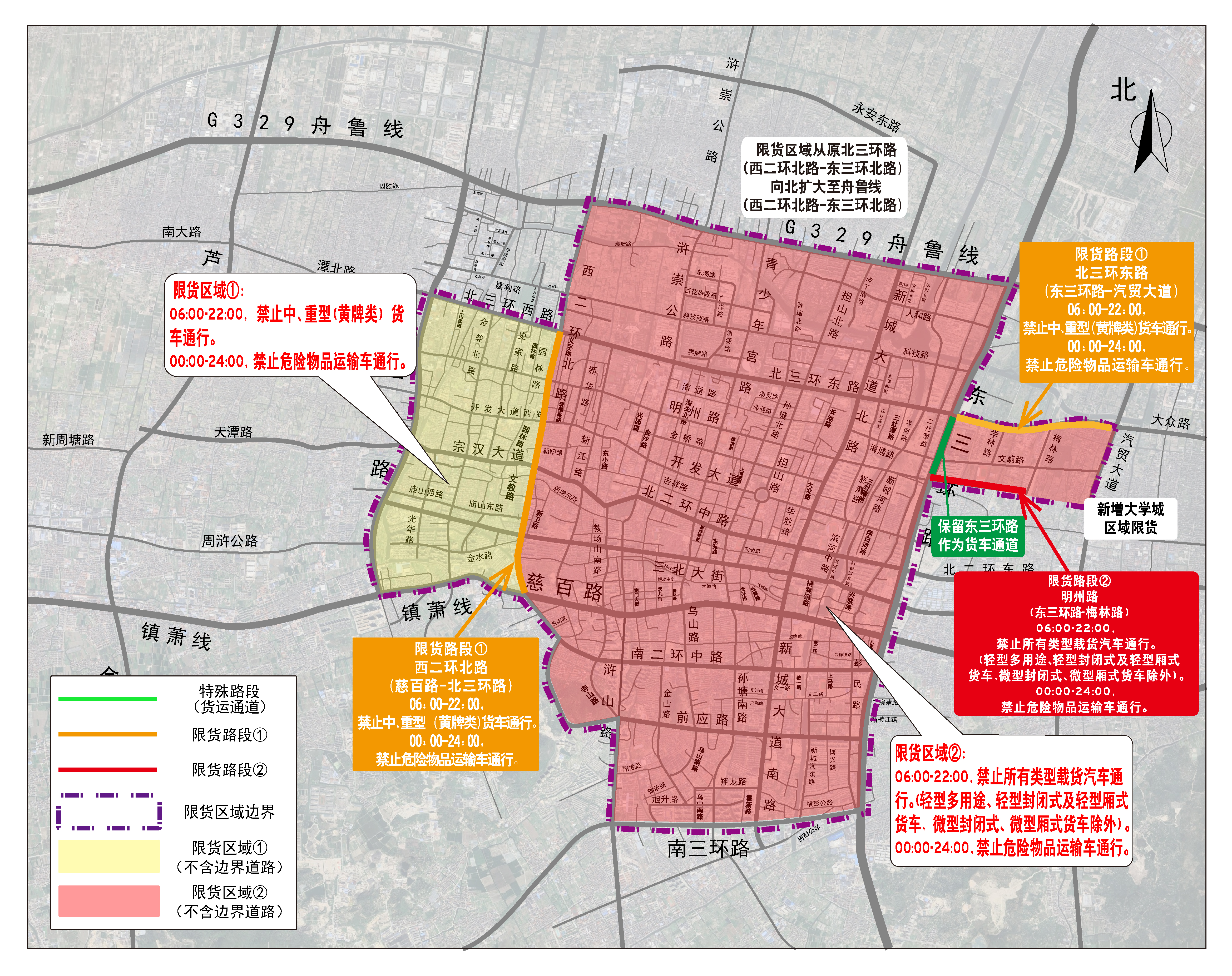 (二)“限貨”區(qū)域②(圖中紅色區(qū)域):西二環(huán)北路—G329舟魯線—東三環(huán)北路—北三環(huán)東路—汽貿(mào)大道—明州路—東三環(huán)北(南)路—南三環(huán)路—楊梅大道北路—前應(yīng)路—西二環(huán)南路所形成的區(qū)域(不含邊界道路)。