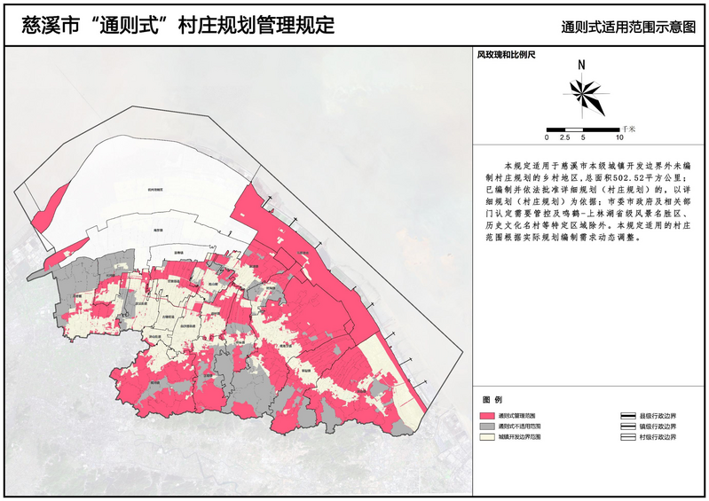 本規定適用于慈溪市本級城鎮開發邊界外未編制村莊規劃的鄉村地區,涵蓋農村住宅建設、鄉村公共設施、公益事業和使用存量建設用地的鄉村一二三產融合項目。已編制并依法批準詳細規劃(村莊規劃)的,以詳細規劃(村莊規劃)為依據;市委市政府及相關部門認定需要管控及鳴鶴-上林湖省級風景名勝區、歷史文化名村等特定區域除外。本規定適用的村莊范圍根據實際規劃編制需求動態調整。