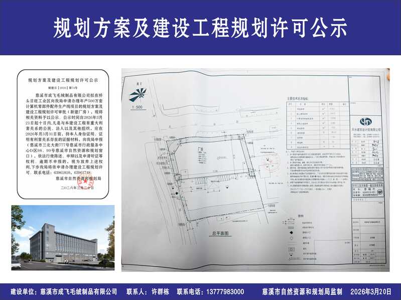 慈溪市成飛毛絨制品有限公司擬在橋頭日旺工業區向我局申請辦理年產500萬套計算機零部件配件生產線項目的規劃方案及建設工程規劃許可審批(新建廠房),現將相關資料予以公示。公示時間自2026年3月21日起十日內,凡是與本建設工程有重大利害關系的公民、法人以及其他組織,應在2026年月3月31日前,持本人身份證明、證明有利害關系存在的證據材料,向我局申報(慈溪市三北大街777號慈溪市行政服務中心D區98、99號慈溪市自然資源和規劃窗口),依法行使陳述、申辯以及申請聽證等權利。逾期不申報的,視為放棄上述權利,下步我局將依申請辦理建設工程規劃許可。聯系電話:63961810,63961748。
