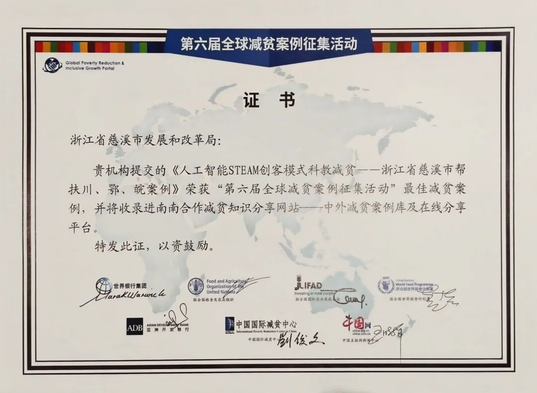 12月10日,2025年全球減貧伙伴研討會在北京成功舉辦,會上發布了第六屆“全球減貧案例征集活動”獲獎案例名單。浙江省共有12個案例上榜,其中由慈溪市發展和改革局報送的《人工智能STEAM創客模式科教減貧——浙江省慈溪市川、鄂、皖幫扶案例》榮獲聯合國第六屆全球減貧最佳案例,系寧波市唯一。
