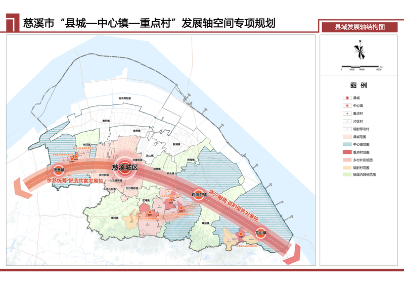 圍繞縮小“三大差距”,做好“強城”“興村”“融合”三篇文章,將慈溪市“縣城—中心鎮—重點村”發展軸打造成為“慈溪城鄉躍升、全民共富發展軸”,實現城提新能級、鎮上新臺階、村創新特色,推動慈溪在區域協同、產業升級、民生共享等領域實現突破,譜寫區域融合協同共富新篇章。