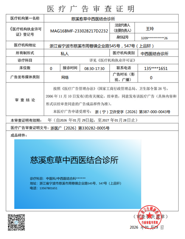 慈溪愈草中西醫結合診所于2026年1月29日向我局提出醫療廣告審查申請。按照《醫療廣告管理辦法》等有關規定,經審查,同意發布該醫療廣告(具體內容和形式以經審查同意的廣告成品樣件為準)。