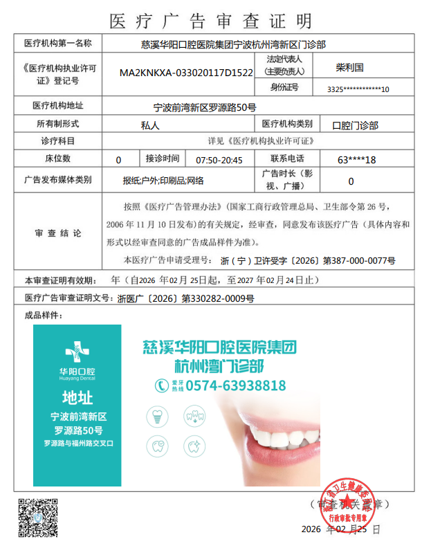 慈溪華陽口腔醫院集團寧波杭州灣新區門診部于2026年2月25日向我局提出醫療廣告審查申請。按照《醫療廣告管理辦法》等有關規定,經審查,同意發布該醫療廣告(具體內容和形式以經審查同意的廣告成品樣件為準)。